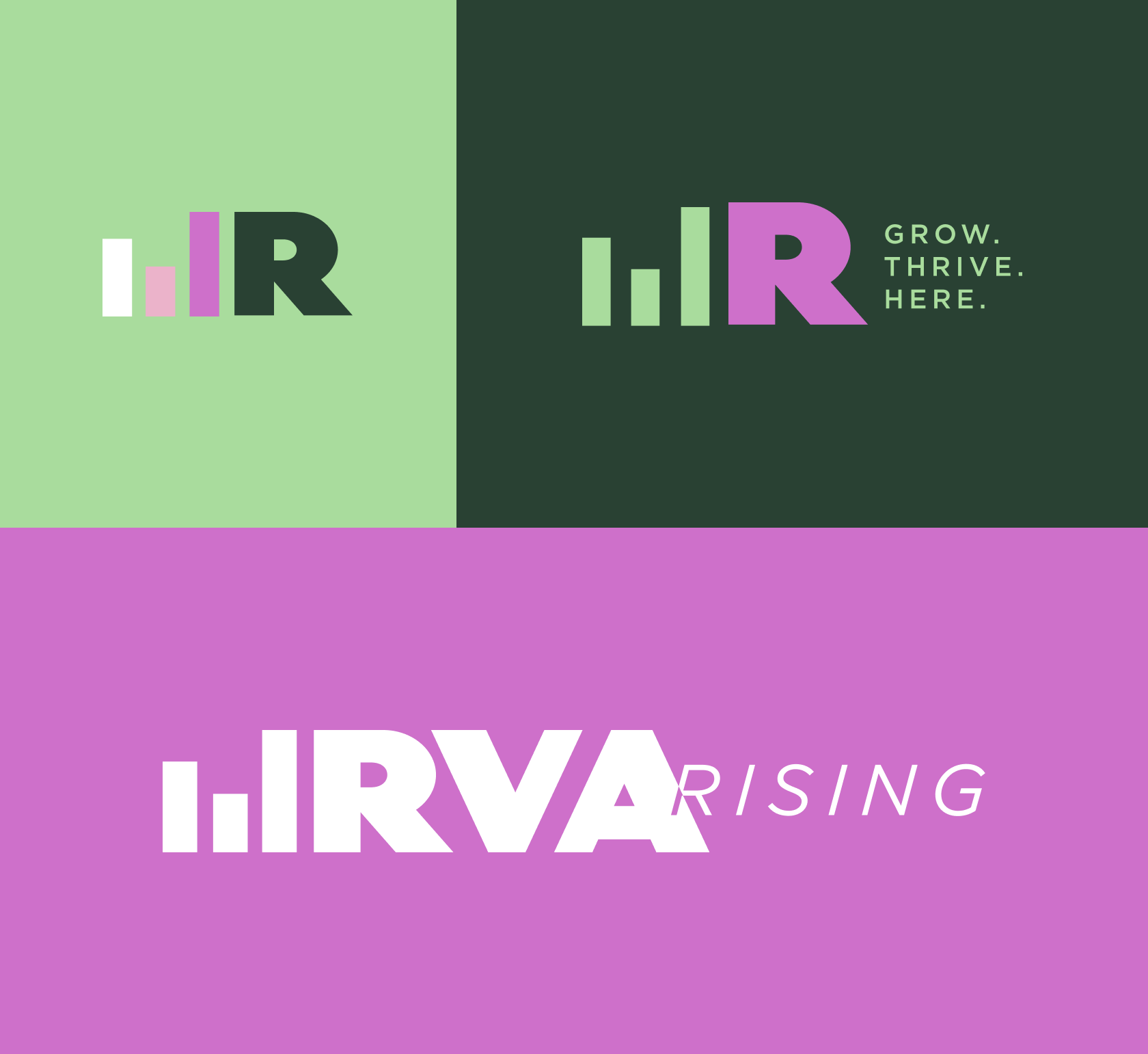 This bold typeface creates a loud statement that embodies that not only is this initiative helping RVA rise, RVA IS rising. Pairing this declaration with an italic font suggests movement and momentum. This movement is further amplified by the bars that hug each tagline line symbolizing the city, the community, and the individual people, all rising together.